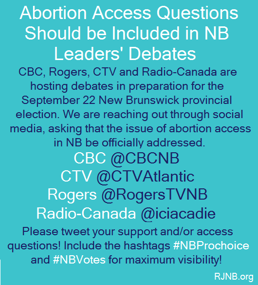 FREDERICTON, NB, August 28, 2014 – Reproductive Justice NB is calling on organizations and media outlets hosting leaders’ debates during the New Brunswick election to include questions about abortion access. As a leading healthcare issue facing the province, leaders must make their positions clear on how they would rectify the lack of safe, equitable and accessible reproductive health care for all New Brunswickers.